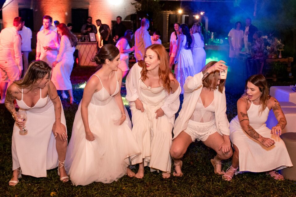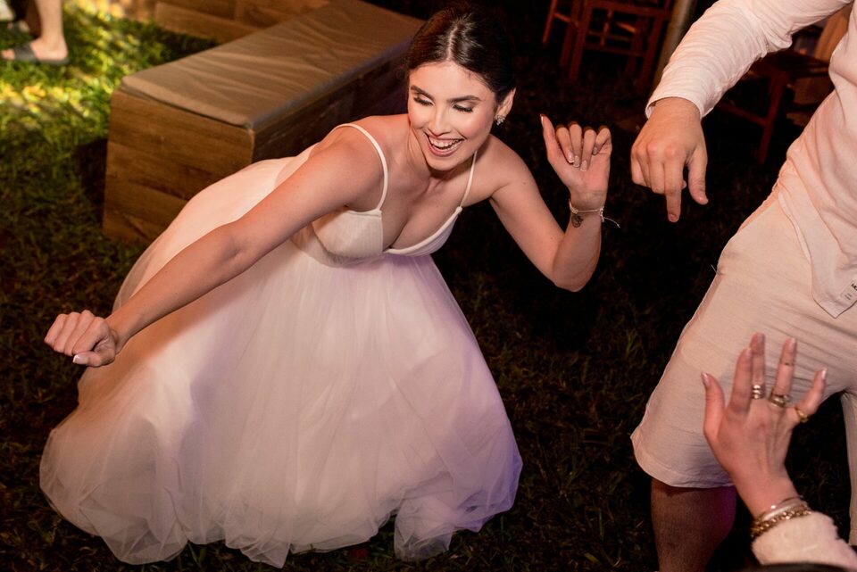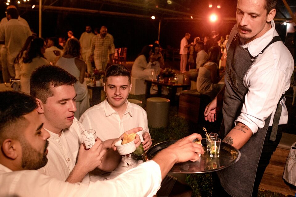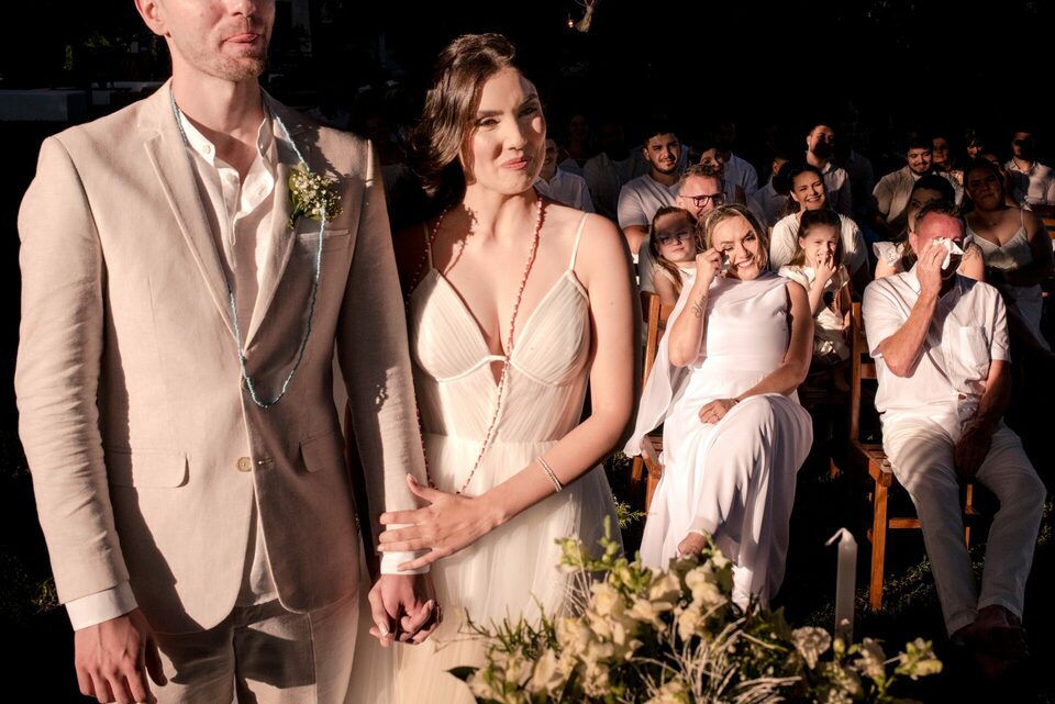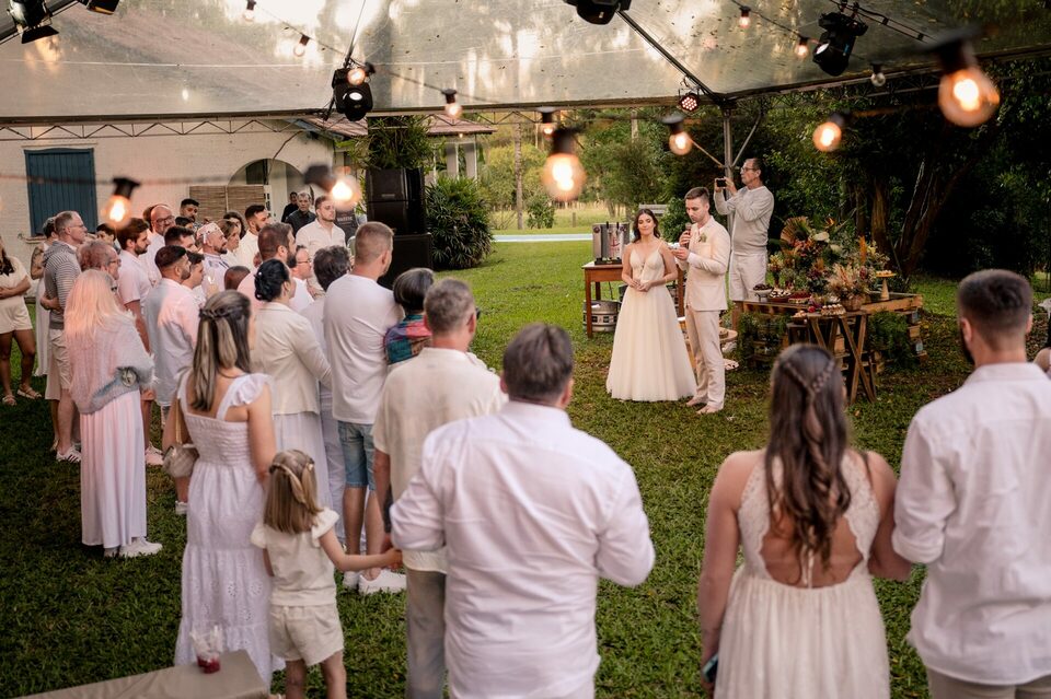 A recepção dos convidados também aconteceu ao ar livre, criando um ambiente descontraído e festivo. Foi uma festa repleta de alegria, música e dança, onde amigos e familiares se uniram para comemorar o amor e a união de Eduarda e Yuri.