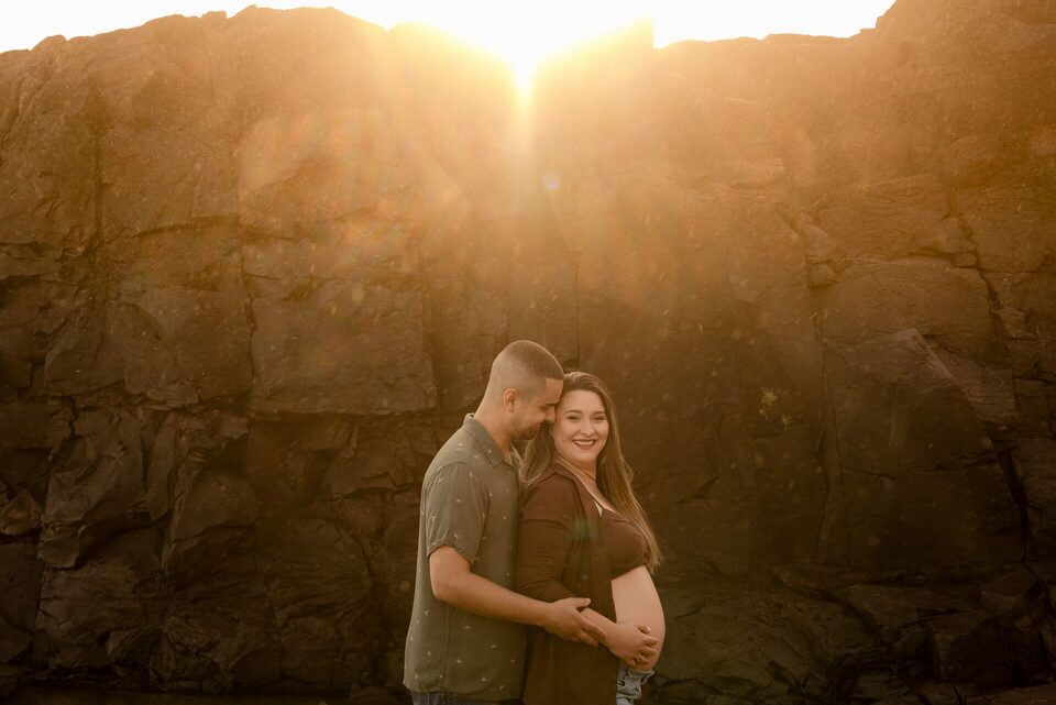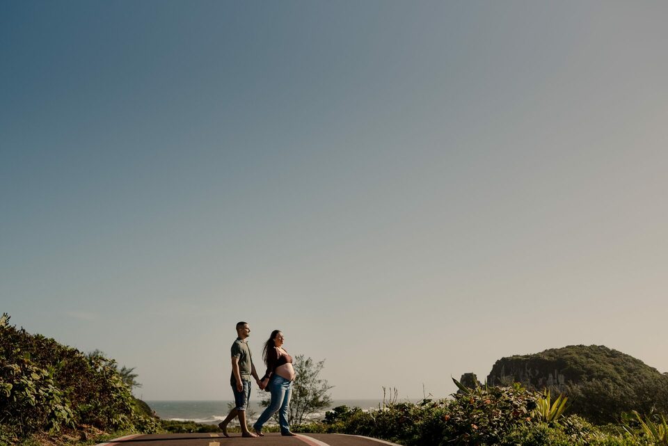 Optamos por caminhar pela areia e pelos mirantes, buscando momentos simples: o toque na barriga, o sorriso, o carinho do Gabriel, e a conexão entre os dois. Meu trabalho como fotógrafo gestante no litoral do Rio Grande do Sul é registrar com calma, respeitando o ritmo do casal e a delicadeza dessa etapa.