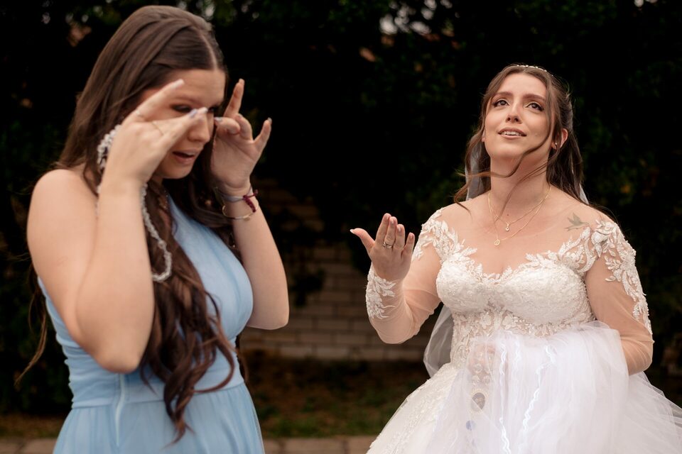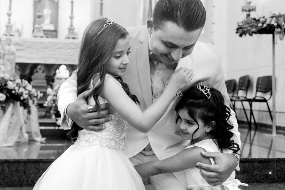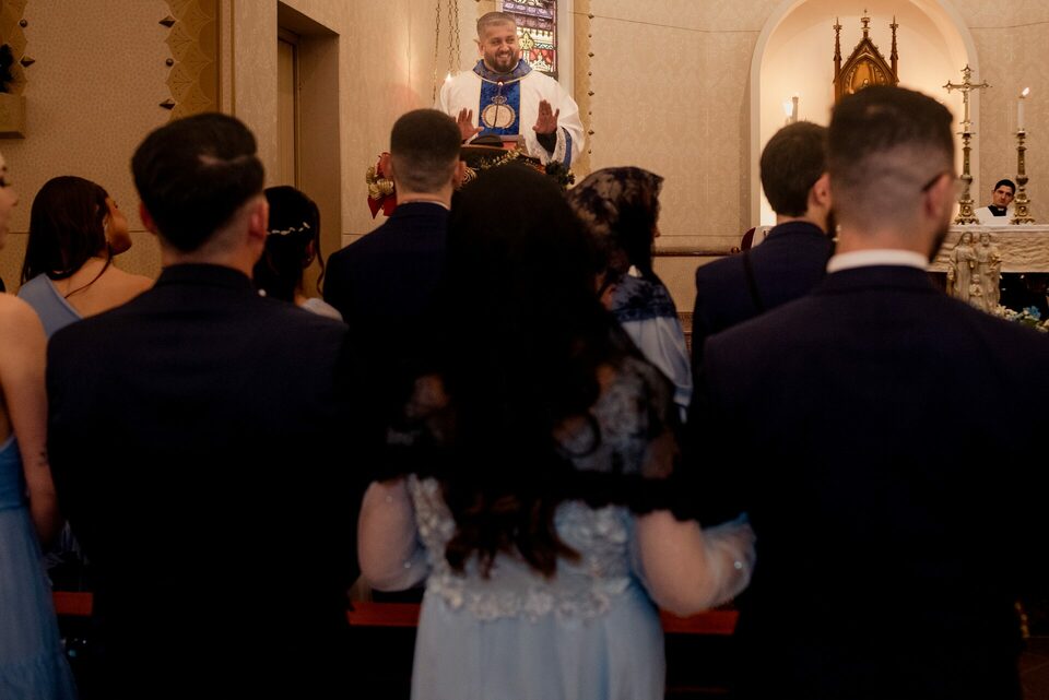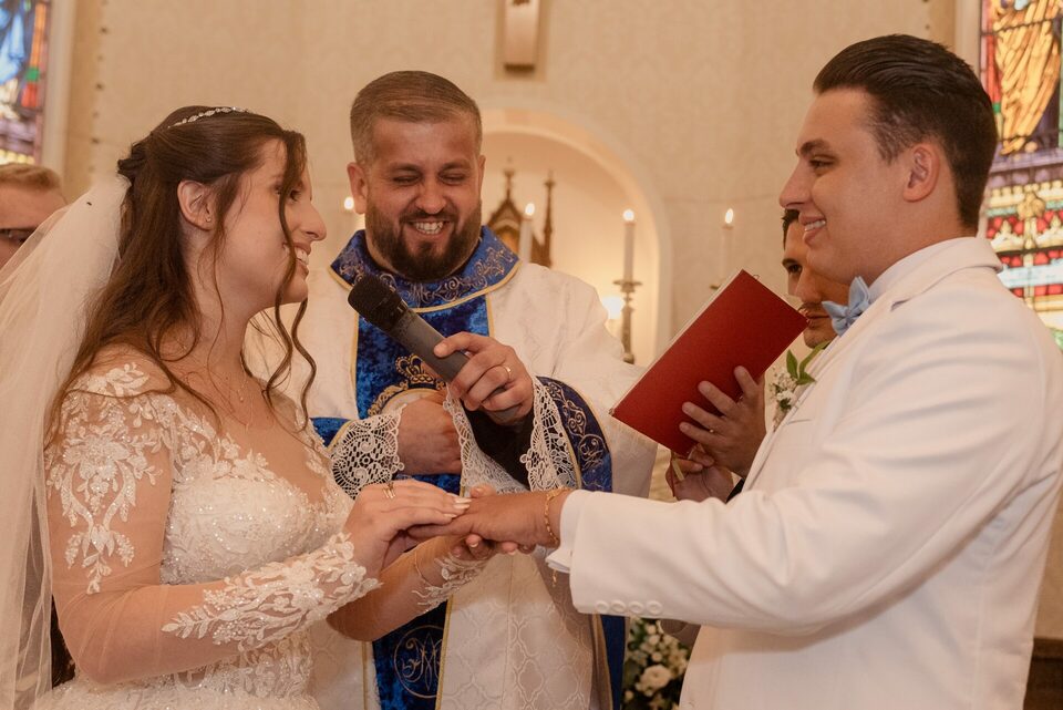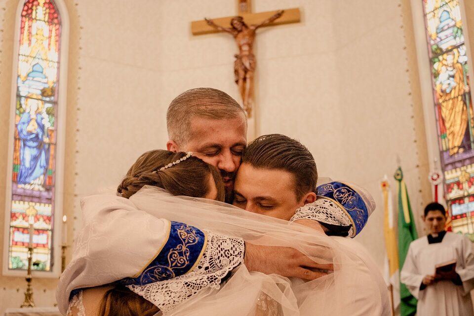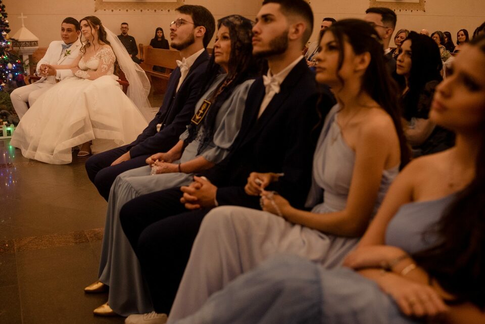 A cerimônia religiosa foi celebrada por seus padrinhos, que são padres, trazendo um toque único de fé e proximidade. As palavras pronunciadas durante o casamento em Sapiranga tocaram o coração de todos, especialmente quando, na ação de graças, os noivos cantaram juntos, emocionando os convidados.