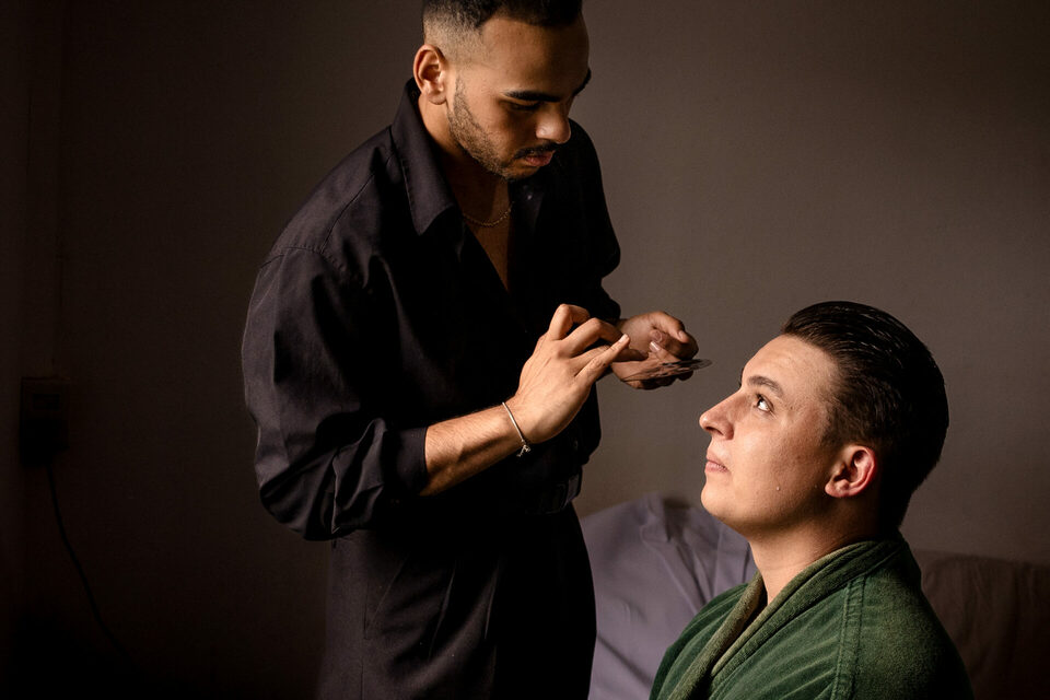 Antes da cerimônia, o momento mais aguardado foi o first touch, onde os noivos se encontraram sem se ver, apenas sentindo a presença um do outro. um momento repleto de emoção e carinho, tornando esse instante ainda mais especial.